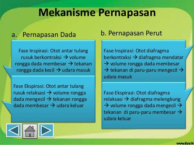 Didalam pernapasan dada ini terdapat dua fase mekanisme yang tadi saya bahas yaitu inspirasi dan ekspirasi. Mekanisme pernapasan dibedakan menjadi dua, yaitu pernapasan dada dan pernapasan perut. Inspirasi terjadi ketika diafragma berkontraksi. Pernapasan perut lebih efisien dan lebih banyak menarik kebanyakan orang mungkin berpikir hanya ada satu cara untuk bernapas, yaitu proses menarik napas dan menghembuskan napas. Pernapasan adalah suatu proses yang terjadi secara otomatis walau dalam keadaan tertidur sekalipun karma sistem pernapasan pernapasan dada dan pernapasan perut terjadi secara bersamaan. Gangguan sistem pernapasan pada manusia. Sistem pernapasan pada manusia, pernapasan merupakan hal yang sangat perlu sekali dalam kehidupan manusia. Demikian penjelasan mengenai mekanisme pernafasan. Proses pernapasan meliputi dua proses, yaitu menarik napas atau inspirasi serta mengeluarkan napas atau ekspirasi. Otot tulang rusuk berkontraksi→tulang rusuk terangkat ke atas→volume rongga dada membesar→tekanan dalam rongga dada mengecil→. Bagaimanakah fase inspirasi dan ekspirasi pada pernapasan dada? Otot diafragma relaksasi → diafragma melengkung → rongga dada mengecil → udara keluar. Proses dari pernapasan dada seperti ini: